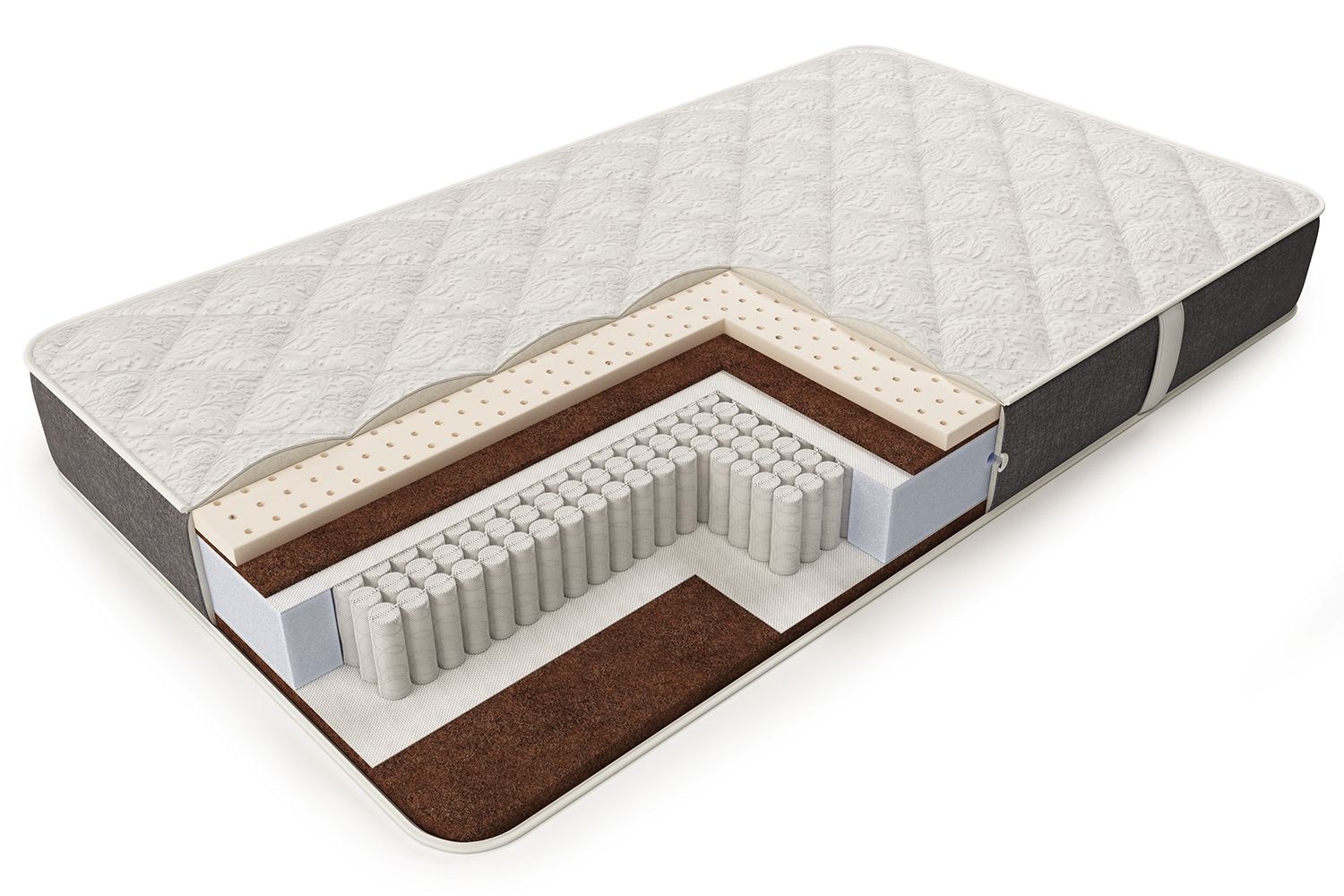 Листы из кокосовой койры высокой плотности – 100 кг./м3 создают дополнительную поддержку и увеличивают жесткость матраса. В Otto Bayer George листы из кокосовой койры имеют толщину 1 см. с одной стороны и 3 см. с другой стороны матраса. Плотная кокосовая койра 100 кг./м3 гораздо жёстче и долговечнее аналогов с плотностью 60 и 80 кг./м3.